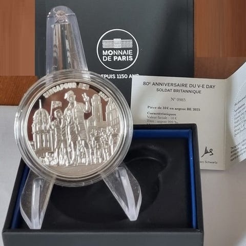 Jaartal: 2025Kvaliteit: ProofDiameter: 37 mmGewicht: 22,18 gramMateriaal: Zilver, Ag 0,999Thema: 80 Jaar Vrijheid in Europa, Canadese SoldaatOntwerper(s): Joaquin Jiménez Elf maanden na de landing op de stranden van Normandië vieren geallieerde troepen verspreid over Europa de overgave van nazi-Duitsland. Op 7 mei 1945 tekent de Duitse generaal Alfred Jodl de overgave in de Franse plaats Reims. Eisenhawers stafchef en een Sovjet-generaal tekenen namens de geallieerden. In het document staat dat alle Duitse strijdkrachten op 8 mei 1945 om 23.01 uur zullen stoppen met vechten.Een historische dag, "V-E Day" (Victory in Europe Day), symboliseert het einde van bijna zes jaar conflict en de terugkeer van vrede voor miljoenen Europeanen. 80 jaar na deze beslissende overwinning viert Monnaie de Paris deze historische gebeurtenis door een eerbetoon te brengen aan de grote geallieerde naties die vochten voor de bevrijding van Frankrijk en Europa.Fred, een luitenant bij de Royal Winnipeg Rifles, maakte deel uit van de 3de Canadese Infanteriedivisie die landde op Sword Beach. Zijn eenheid zette de Slag om Normandië voort en vocht bij Caen en Falaise. De divisie trok vervolgens naar de Seine en bevrijdde Rouen op 30 augustus 1944. Ze vervolgde haar weg in Frankrijk en bevrijdde Boulogne-sur-Mer en Calais. De eenheid werd vervolgens naar België en Nederland gestuurd, waar ze deelnam aan de Slag om de Schelde en de Breskens-pocket, en de haven van Antwerpen heropende. De Royal Winnipeg Rifles beëindigde de oorlog in Duitsland, nadat ze de aanval op de stad Aurich had voorbereid.De keerzijde van deze munt toont alle geallieerde landen die officieel deelnamen aan de landing in Normandië, omringd door de nominale waarde en de RF-initialen. Met de klok mee: France Libre, Nederland, Nieuw-Zeeland, Polen, Australië, VS, Noorwegen, VK, Tsjechoslowakije, Canada, België.