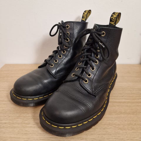 Dr. Martens saappaat, koko 38. Ruskeaa nahkaa, nauhakiinnitys ja kumipohjat. Klassinen AirWair-pohja, jossa keltainen tikkauksiin perustuva reunus. Sopivat arki- ja vapaa-ajan käyttöön. Unisex-malli, joka käy sekä naisille että miehille koon mukaan. Käytetty todella vähän ja vain pohjallisten kanssa. Vaimolle hieman liian isot. Kulkeutuu Parainen-Turku välillä.