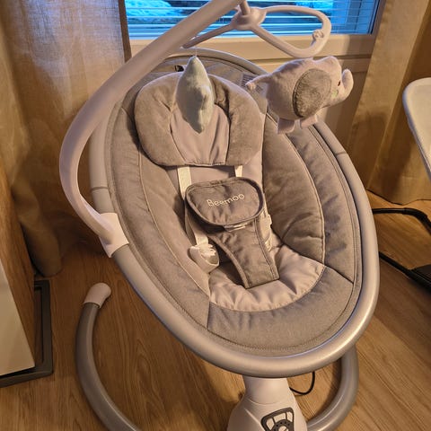 Jollyroom Beemoo lasten sitteri harmaana. Tuolissa on pehmustettu istuinosa ja selkänoja sekä turvavaljaat lapsen kiinnittämistä varten. Runko on kaareva, mikä mahdollistaa keinuvan liikkeen. Tuolin alaosassa on ohjauspaneeli eri asetuksille, ja mukana tulee virtajohto sekä kaukosäädin toimintojen säätämiseen. Keinumis nopeuksia ja eri ääniä. Soveltuu vauvalle tai pienelle lapselle valmistajan suositusten mukaisesti.