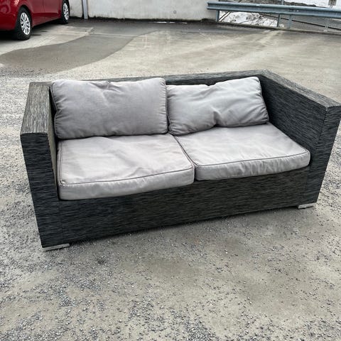 Parvekesohva, jossa tummat/mustat istuin- ja selkänojapehmusteet. Runko on punottua materiaalia, joka soveltuu ulkokäyttöön esimerkiksi parvekkeelle tai terassille. Sohva tarjoaa istumapaikan kahdelle henkilölle ja sopii ulkotilojen oleskeluun.