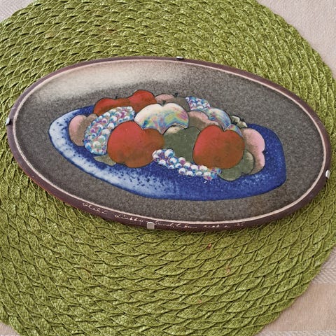 Brita Heilimon 1950-luvulla Arabialle suunnittelema koristelaatta. Viimeisessä kuvassa lisätietoja.