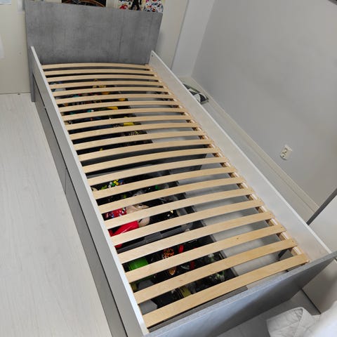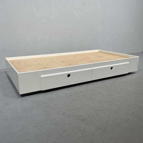 IKEA sänky säilytyslaatikoilla. Valkoinen runko, jossa useita vetolaatikoita ja avohyllyjä sivuilla säilytystä varten. Sopii yhden hengen sängyksi.