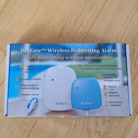 Hetken aikaa käytössä ollut, sininen Wet stop 3 -yökasteluhälytin. Toimii, mukaan suomenkieliset ohjeet.
