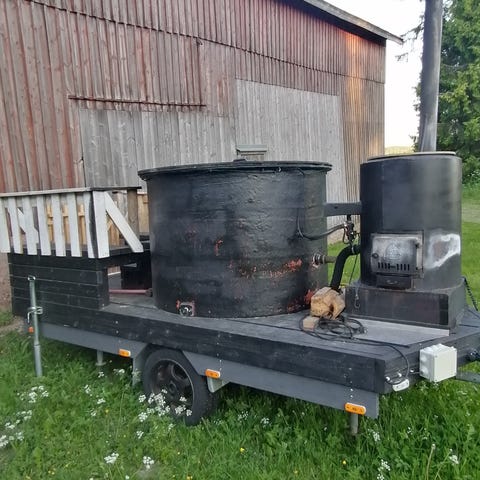 Palju isoon tarpeeseen! 6-8 ihmistä mahtuu samaan aikaan, eli iso palju! Sisälle laitettu epoxi maali. Paljun yhdessä reunassa näkyy että on vähän ottanu kipeää kun puut miten sattuu mutta pitää veden hyvin sisällään.