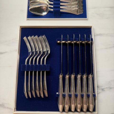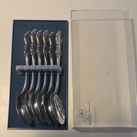 Kultateollisuus lusikkasetti, jossa 6 hopealusikkaa. Lusikat on pakattu alkuperäiseen koteloon, jossa on sininen kangasvuori ja pidikkeet jokaiselle lusikalle. Sopii esimerkiksi kahvi- tai jälkiruokalusikoiksi tai täydentämään kattauksia.