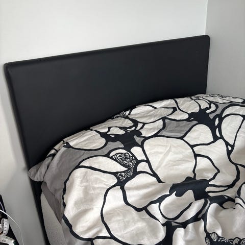 Tukeva itse valmistettu sängynpääty 120 cm leveään vuoteeseen. Puulevy verhoiltu ohuella vanulla ja huputettu muotoonommellulla huonekalukankaalla. Niitit vain alareunassa, joten verhoilu helppoa vaihtaa. Levyn alareunassa 2 porattua reikää (ks kuva) mahd. kiinnitystä varten, minulla pääty oli lattialla ilman kiinnitystä, ja pysyi hyvin paikoillaan. Huom! Kamera vääristää muodon, pääty on suorakaide pyöristetyin yläkulmin.