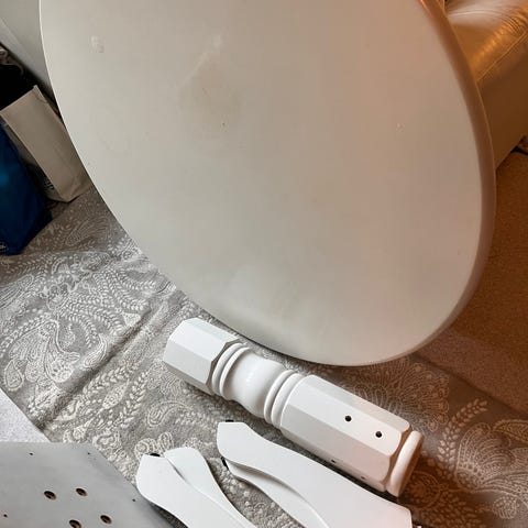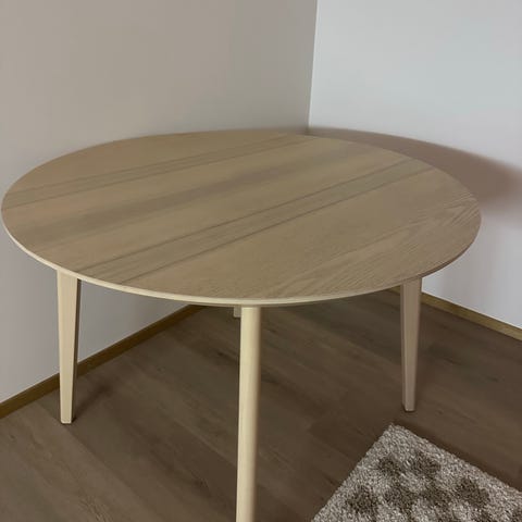 IKEA pyöreä ruokapöytä. Pöydässä on valkoinen kansi ja puunväriset jalat. Sopii ruokailutilaan tai keittiöön useammalle hengelle. Pöydän ympärillä voidaan käyttää erillisiä tuoleja. Materiaali vaikuttaa olevan puuta ja puupohjaista levyä. Väri on neutraali, joten pöytä on helppo yhdistää erilaisiin sisustuksiin.