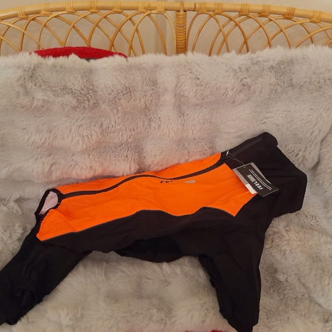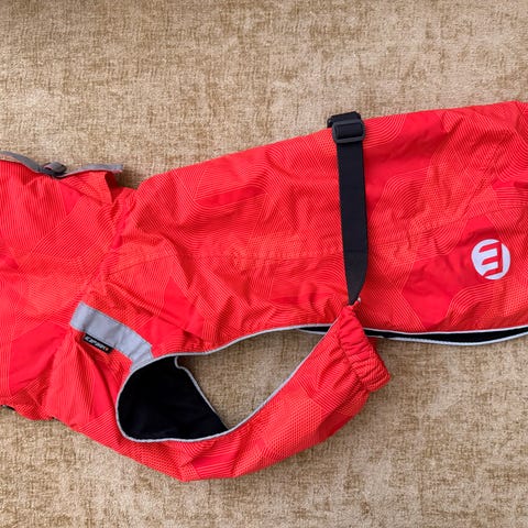 Vedenpitävä ja hengittävä sadehaalari joustavaa softshelliä. Säädettävä kuminauha rinnan kohdalla ja kaula-aukossa. Vetoketju selän päällä, hihna- ja valjasaukot. Lahkeissa tarranauhakiristys. Uusi, vain sovitettu koiralle liikkeessä.