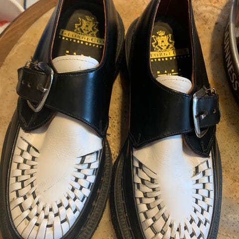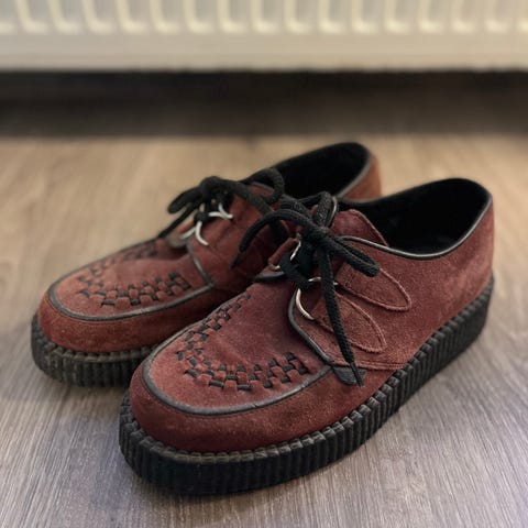 Underground originals custom order creeper kengät. Burgundyn väriset, mokkanahkaa, pohja tukevaa ja painavaa kumia. Pohjan korkeus kannasta noin 9cm, kärjestä 6cm.