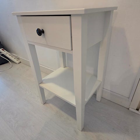 Valkoinen, pieni pöytä, jossa laatikko ja hylly, sopii yöpöydäksi.