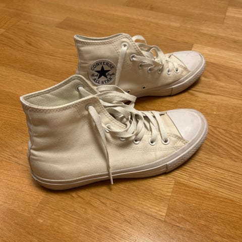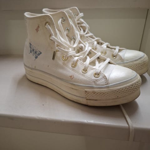 Uudelleen pesemällä ja valkaisemalla tästä saa lähes uudenveroiset kengät. Nämä ovat olleet minulla käytössä siisteinä messukenkinä.