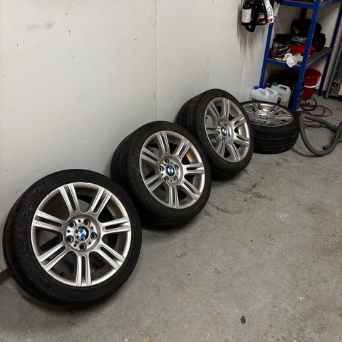 Bmw.n vanteet. Ronal merkkiset ja päällä vanhat Goodride kitkarenkaat joissa pintaa 4mm tai vähän enemmän. 225/45/17 joten menee ainakin 3-sarjalaiseen.