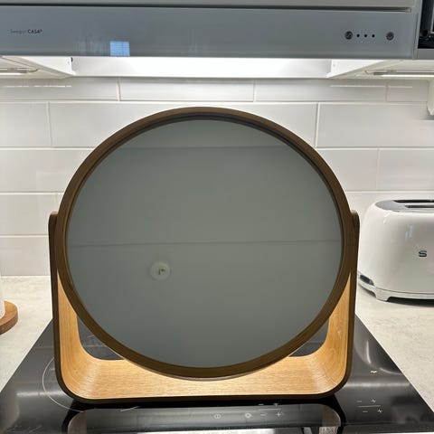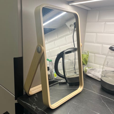 Peilissä on suorakulmainen peilipinta ja yläosassa koristeellinen metallikehys. Runko on mustaa metallia ja peilin alaosassa on avoin taso tai pieni hylly tavaroiden säilytykseen, esimerkiksi koruille tai kosmetiikalle. Sopii käytettäväksi meikki- tai kampauspöydällä sekä yleisenä pöytäspeilinä.