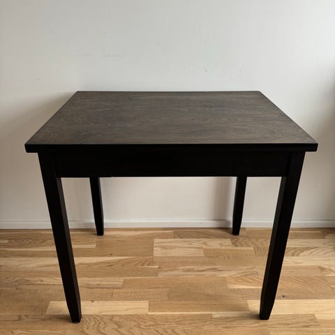 Mustaksi maalattu mäntyinen pirtin pöytä.
