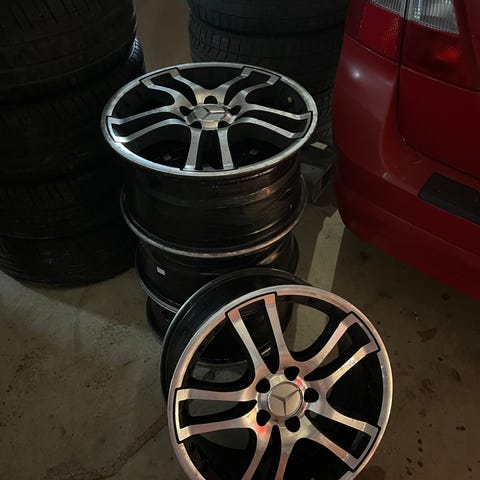 Varattu perjantai-iltaan asti. Olleet W211 E-mersussa. Likaiset varastoinnin jäljiltä, mutta ihan siistit kun pesee. Vanteet ovat suorat. Päällä huonot renkaat. 17”