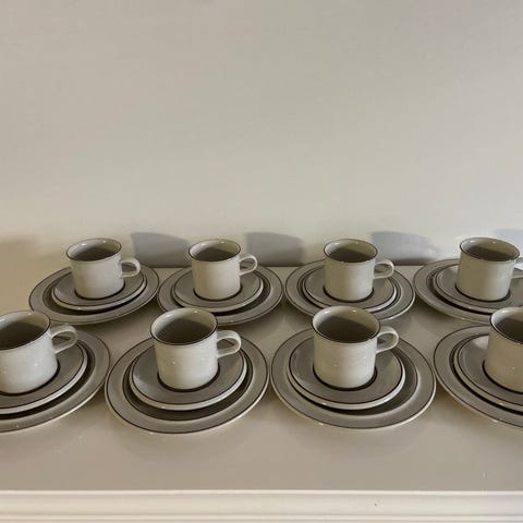 Arabia lautaset, joissa vaalea pohjaväri ja tumma reunakoriste. Kuvissa näkyy useita matalia ja syvempiä lautasia saman sarjan kuosilla. Materiaalina on lasitettu keramiikka/posliini. Sopivat arki- ja kattauksessa myös juhlakäyttöön. Tarkemmat mitat ja kappalemäärä kannattaa ilmoittaa erikseen.