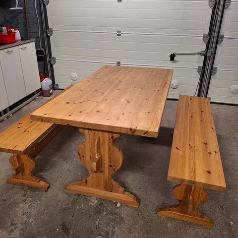 Suomalaista käsityötä pirttipöytä + penkit. Vankkaa puuta, on höylättävissä + hoidettavissa. Käytännössä ikuiset kalusteet. Ruokapöytä / ruokailuryhmä.