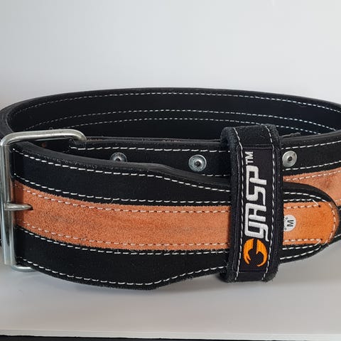 Nahkainen musta vyö valkoisilla tikkauksilla