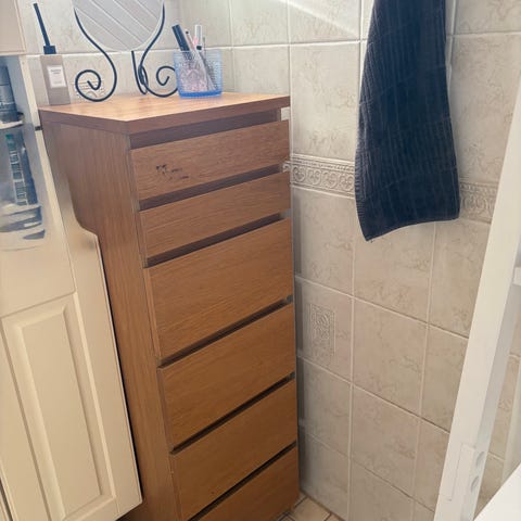 Myydään valkoinen Ikean Malm lipasto. Alaosan rima mennyt rikki ja puuttuu, siksi tuo väli näkyy.