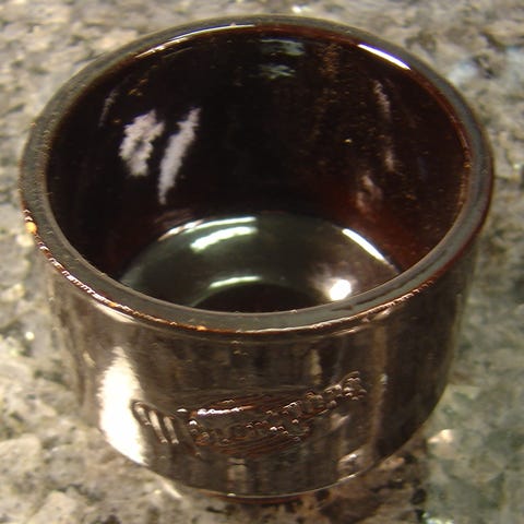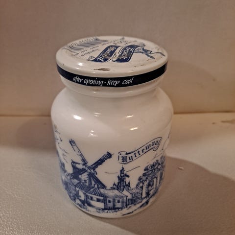 Keraaminen ruskea purkki kannella. Purkissa on kaksi pientä korvaketta sivuilla ja kohokuvioituja merkintöjä ulkopinnassa. Sisäpinta on lasitettu. Sopii esimerkiksi keittiöön kuivatuotteiden, mausteiden tai pienten esineiden säilytykseen.