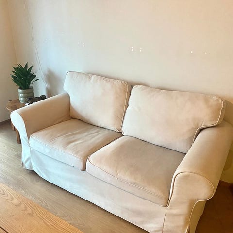 Hyväkuntoinen valkoinen ikean sohva. Irrotettavat päälliset, jotka voi pestä koneessa. Kissatalous.