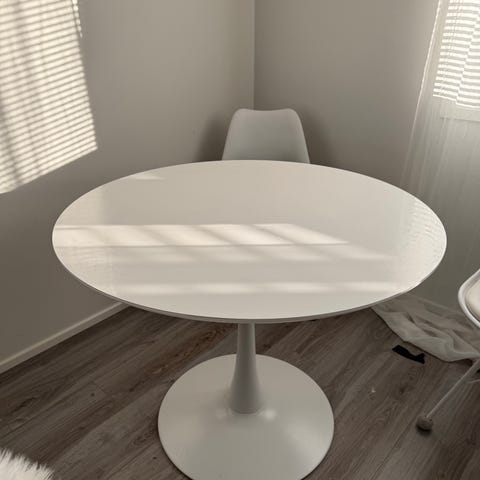 Myydään tyylikäs pyöreä ruokapöytä. Valkoinen pöytälevy ja puiset jalat antavat pöydälle modernin ja ajattoman ilmeen. Sopii hyvin keittiöön tai ruokailutilaan.