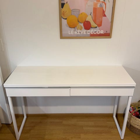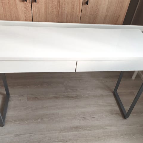 Valkoinen työpöytä, jossa on kaksi vetolaatikkoa ja johtohylly. Pöydässä on toisessa päädyssä umpinainen sivu, toisessa metallinen jalka. Sopii esimerkiksi työpisteeksi, läksypöydäksi tai tietokonepöydäksi. Materiaalina maalattu puu/puukuitulevy ja metallijalka.