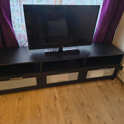 180cm leveä IKEAn Brimnes TV-Taso kolmella vetolaatikolla. Pieniä jälkiä varmasti jossain kohti, mutta yleisilme oikein siisti.