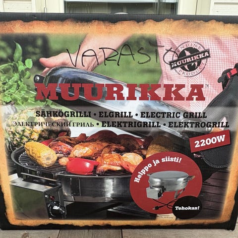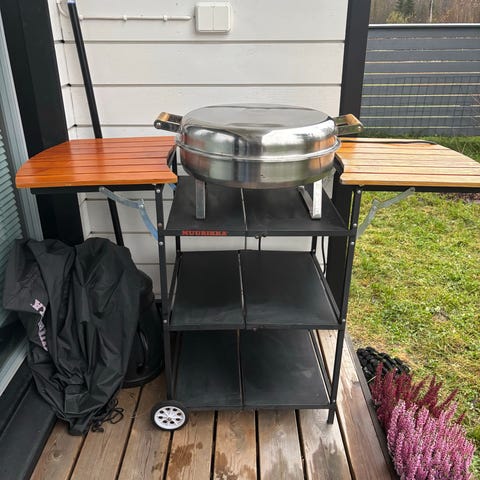 Muurikka Kesäkeittiö sähkögrilli musta. Sähkötoiminen grilli, jossa on metallinen grillausosa ja puinen kahva kannessa. Grilli on sijoitettu mustaan kärrymalliseen kesäkeittiöön, jossa on sivutasot ja useita hyllyjä tarvikkeiden säilytykseen. Mukana on Muurikka-sähkögrillin suojarasia sekä kantolaukku grilliä tai tarvikkeita varten. Soveltuu ruoanlaittoon ulkotiloissa, kuten terassilla tai pihalla, sähköliitännän läheisyydessä.