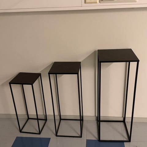 Kukkapöytä sisälle tai ulos, minulla ollut parvekkeella. Ostettu käytettynä. Muuten hyvä, mutta yksi lasiosista nurkasta ja kyljestä rikkoutunut, teipattu niitä. Lasiosat lähtevät irti.