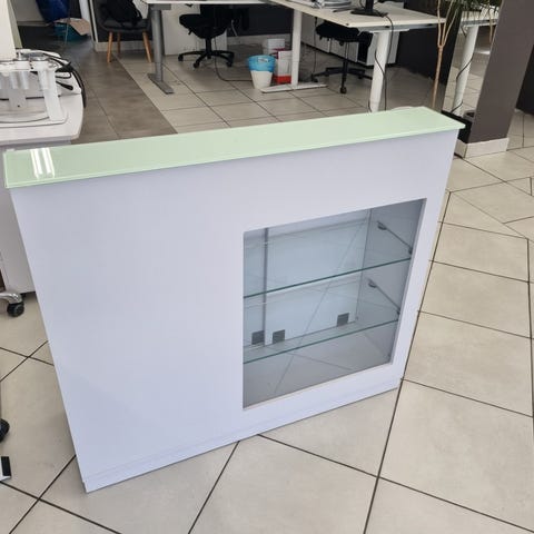 Valkoinen vastaanottotiski, jossa avohyllyjä ja vetolaatikko. Yläosassa taso, jonka päällä korotettu taustaosa. Sopii esimerkiksi toimisto- tai kampaamo käyttöön ja muiden tarvikkeiden säilytykseen. Materiaalina maalattu puulevy tai vastaava kalustemateriaali. Kestävä runko