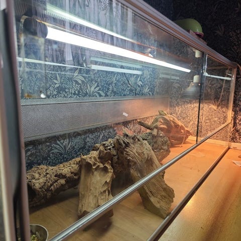 Sijaitsee Orimattilassa kerrostalossa 2.kerroksessa, ei hissiä. Terran sisälle laseihin liimattu kivilaattaa kolmelle seinälle, joten terraario todellakin on painava! Omat kantajat, allekirjoittanut ei valitettavasti kykene avustamaan kantamisessa.