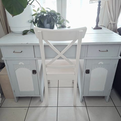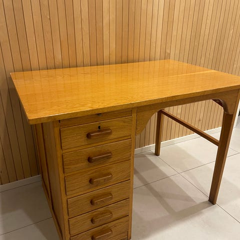 Vanha, entisöity täyspuinen työpöytä. Oikean puoleisen oven saa lukkoon. Leveys 133,7 cm, syvyys 66,5 cm, korkeus 75 cm. Oikean puolen päätylevy työntynyt hieman ulospäin (näkyy kuvissa).