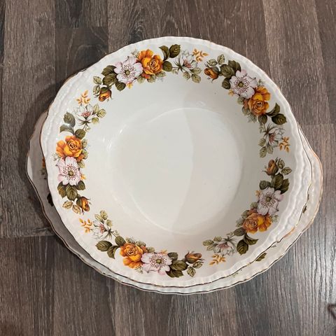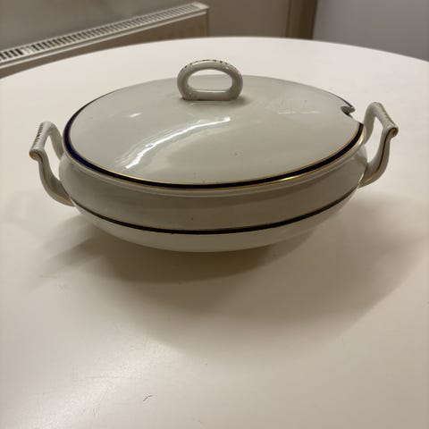Valmistaja Kahla. Korkeus 10 cm, kannen kanssa n. 14 cm. Ruusu- ja kultakoristeinen. Pieni kuluma kannen ottimen kultauksessa.