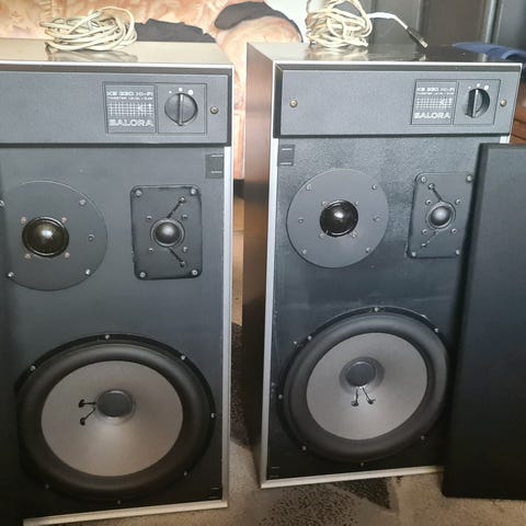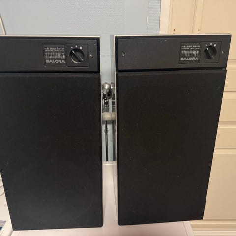 Saloran kaiutinpari 1970-luvun alkupuolelta myynnissä. Ilmeisesti kyseessä on Saloran 100 A viritinvahvistimeen kuuluvat kaiuttimet. Tekniset tiedot löytyvät takana olevasta tarrasta (ks. ilmoituksen kuvat). Kaiuttimien mitat ovat 46 cm × 27,4 cm x 22,4 cm (korkeus, leveys ja syvyys). Kaiuttimien mukaan tulee alkuperäiset DIN-liittimillä olevat johdot, jotka ovat n. 5 metriä pitkät.
