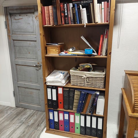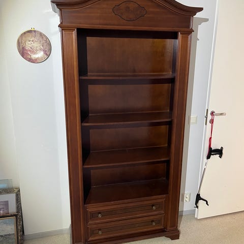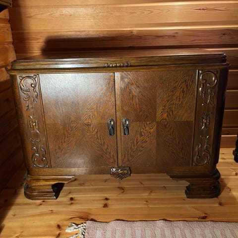 Puinen seinähylly, jossa kaksi pientä kaappia sivuilla ja avohylly keskellä. Hylly on suunniteltu seinälle kiinnitettäväksi ja sopii esimerkiksi eteiseen, keittiöön tai olohuoneeseen pientavaroiden ja koriste-esineiden säilytykseen ja esillepanoon. Materiaalina lakattu puu, luonnonpuun sävy.