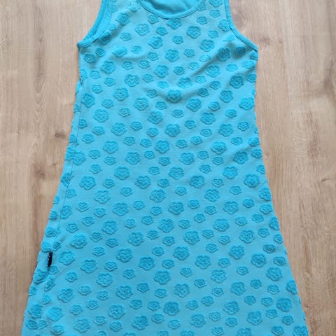 Mekko, väri tummansininen. Takana vetoketju. Pituus 68 cm olka-helma ja kainalomitta 35 cm