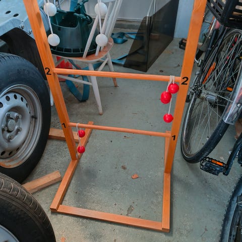 Sekalainen lajitelma palloja ja kiekkoja. Korissa on tennispalloja, muutamia golfpalloja, sählypallo, sulkapallo sekä monta jääkiekkokiekkoa.