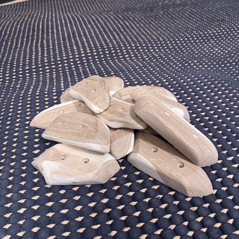 6 isompaa ja 6 pienempää kiipeilyotetta. Kaikki pintsejä, joissa ujo muutaman asteen leikkaus sisäänpäin. Sopii aloittelijoille suoralle seinälle ja edistyneille kiipeilijöille jopa 40-60 asteen hänkille. Jos haluat brutaalin pintsivoiman käyttöösi pikimmiten, niin nämä kannattaa ostaa mahdollisimman nopeasti. Kuvien vaaleammissa otteissa on tietyssä valaistuksessa erikoisesti valoa taittava kuvio, jota ei oikein saa kuvattua puhelimen kameralla.