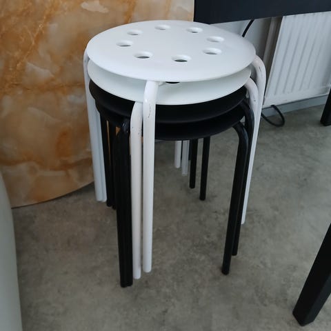 Kaksi jakkaraa, korkeus 44 cm, halkaisija 33 cm, jaloissa vähän kolhuja. Hinta yhteensä 6 e.
