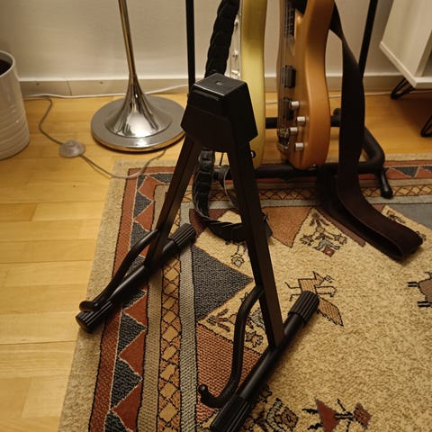 Metalliset kokoontaitettavat kitaratelineet pehmusteilla. Hyvässä kunnossa. Vähän painaumaa kitarasta/bassosta, mutta ei haittaa käyttöä. Kuvissä näkyvät hopeiset laput saa irti.