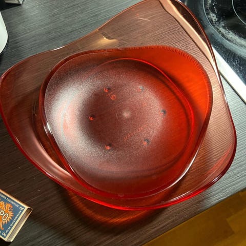 Tupperware kulhosetti, jossa kolme eriväristä kulhoa (oranssi, vihreä ja violetti). Kulhot ovat aaltoreunaisia ja valmistettu muovista. Sopivat esimerkiksi tarjoiluun, naposteltaville tai pienten ruokien kattaukseen keittiössä tai arjen käyttöön. Kaikki 3 kpl yhteensä 18,-.