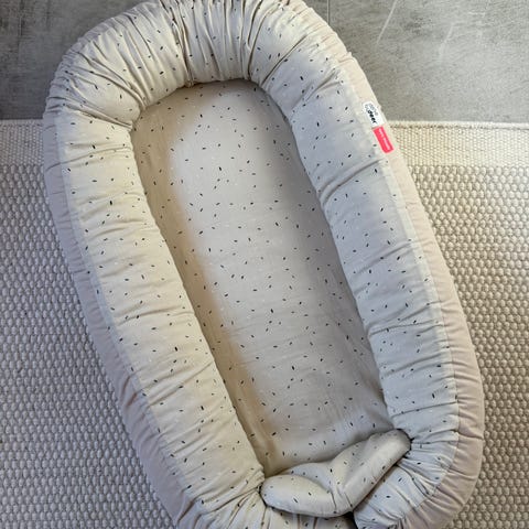 Meow vauvan vaaleanbeige vauvanpesä . Pehmeäpintainen, lampaankarvaa muistuttava kangas ja punottu reunus, joka muodostaa vauvalle rajatun ja pehmeän makuupaikan. Irrotettava, solmittava pohjapehmuste helpottaa pesän puhdistamista. Soveltuu vauvan lepäämiseen esimerkiksi sängyssä, sohvalla tai lattialla aikuisen valvonnassa.