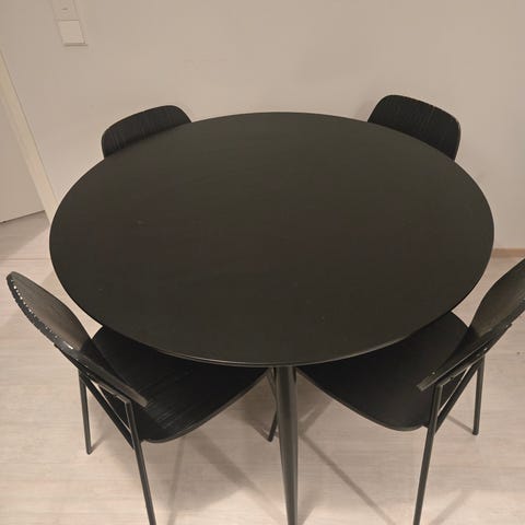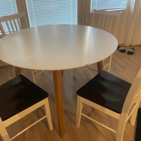 Myydään pyöreä ruokapöytä ja neljä tuolia. Pöytä on tummanruskeaa täyspuuta ja sopii ruokailu- tai oleskelutilaan. Pöydän saa keskeltä pidennettyä ja sen jälkeen koko on 140 x 110 cm. Tuoleissa on puurunko ja vaaleat istuinpehmusteet. Kokonaisuus soveltuu esimerkiksi keittiöön tai ruokailutilaan useamman hengen käyttöön. Pöydässä on pieniä jälkiä, jotka saa käsiteltyä pois.