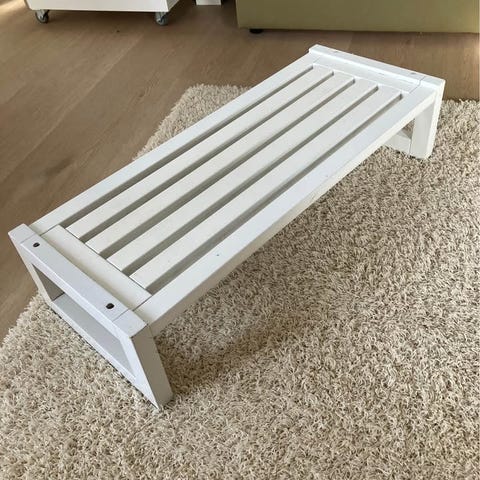 Ikeasta tai Jyskistä joskus ostettu kenkäteline. Kunto ihan ok, on vähän naarmuja ja kolhuja mutta on muuten tukeva ja toimiva. Toimii myös penkkinä. Vain nouto.