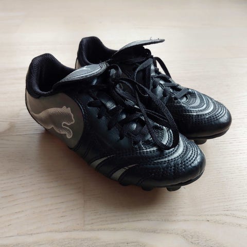 Puma jalkapallokengät. Punainen ja musta väritys, sivuilla valkoinen Puma-logo. Matala varsi ja nauhakiinnitys.