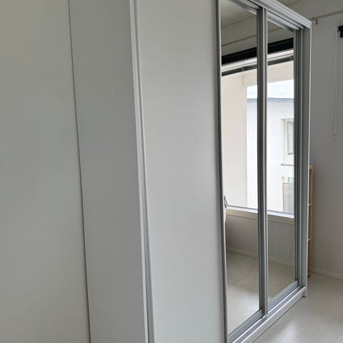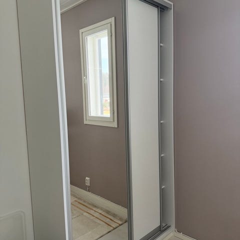 Ikean peili liukuovilla oleva kaappi. Erittäin sopiva kapeaan tilaan ja tavaraa mahtuu silti hyvin. Toisella puolella tanko,toisella puolella lankakorwja 4 kpl plus hyllyjä