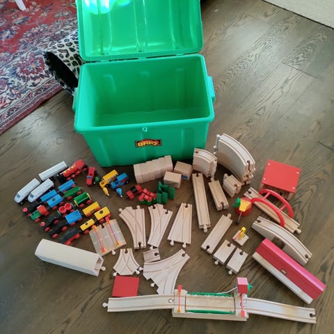 BRIO puinen junarata ja lisäosat. Osat peräisin kahdesta sarjasta ja mukana on ratapalojen lisäksi silta sekä suuri vihreä asemarakennus. Mukana kaksi junaa joista toinen patterikäyttöinen ja kauko-ohjaimella ohjattava.