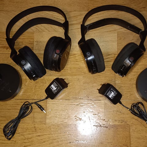 Hyväkuntoiset, langattomat kuulokkeet, mukana oma antenni, tarkempaa tietoa löytyy netistä.