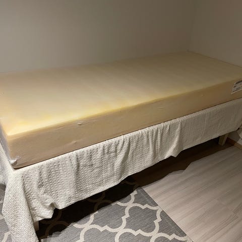 Vaalea yksittäinen patja, koko 90x200 cm. Patjassa on tikattu päällinen ja se sopii yhden hengen sänkyyn tai varavuoteeksi.